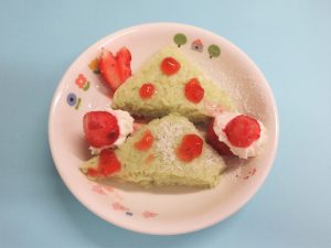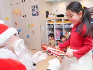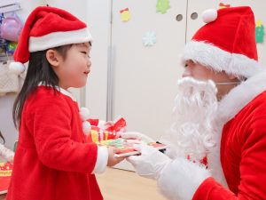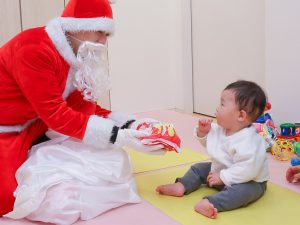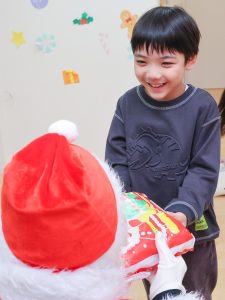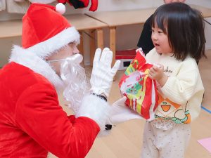 2026.02.16 アルバム クリスマス会(2025年12月24日) ワクワク、ドキドキ・・・のクリスマス会。 みんなで楽しく歌ったあとにサンタさんが・・・。 びっくりしてしまったお友だちもいましたが、握手したり、ぎゅーっと抱きついたり、質問をしたり・・・。 サンタさんからもらったプレゼントを大事に抱え、「また来てね。」と笑顔でお別れしましたよ。 クリスマスメニュー ゆきだるまごはん トナカイナゲット ポテトサラダ チンゲン菜のすまし汁 バナナ ツリー蒸しパン 記事一覧へ戻る