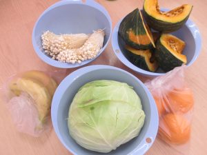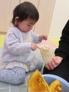 旬のかぼちゃや親しみのあるバナナ・オレンジに加え、ちぎったりさいたりできる『えのき』ときゃべつに触れました。