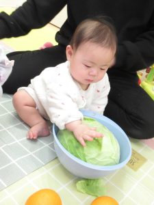 きゃべつの葉っぱをちぎってみたりかぼちゃの種を一つひとつ取ってみたり、手指の運動にもなったようです。
