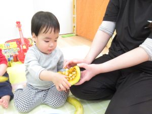 食育にも慣れてきたひよこぐみの子どもたちは、緊張した様子もなく積極的に食材に触れることができました。