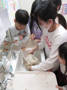 しいたけ栽培の準備では、茶色くてゴツゴツした菌床に興味津々の子どもたち。