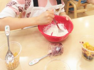 保育園最後の食育として、きりんぐみさんのリクエストに応えて『パフェづくり』を行いました。