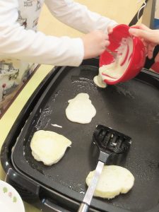 ホットケーキ作りは、ホットプレートに混ぜた生地を流して焼き裏返すところまでやってもらいました。