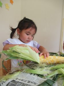 大きなとうもろこしを持って一生懸命ムキムキ💦