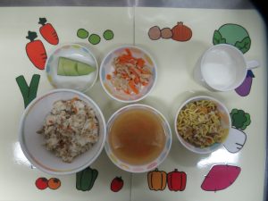 きんぎょごはん・やみつきチキン・ほうれん草のごま和え・オクラのみそ汁・すいか