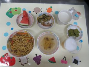 焼きそば・かにさんウインナー・きゅうりの浅漬け・夏野菜スープ・すいか