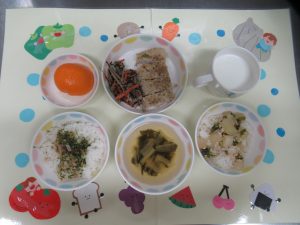給食は…ふりかけごはん・松風焼き・ごぼうサラダ・大根とわかめのしらす和え